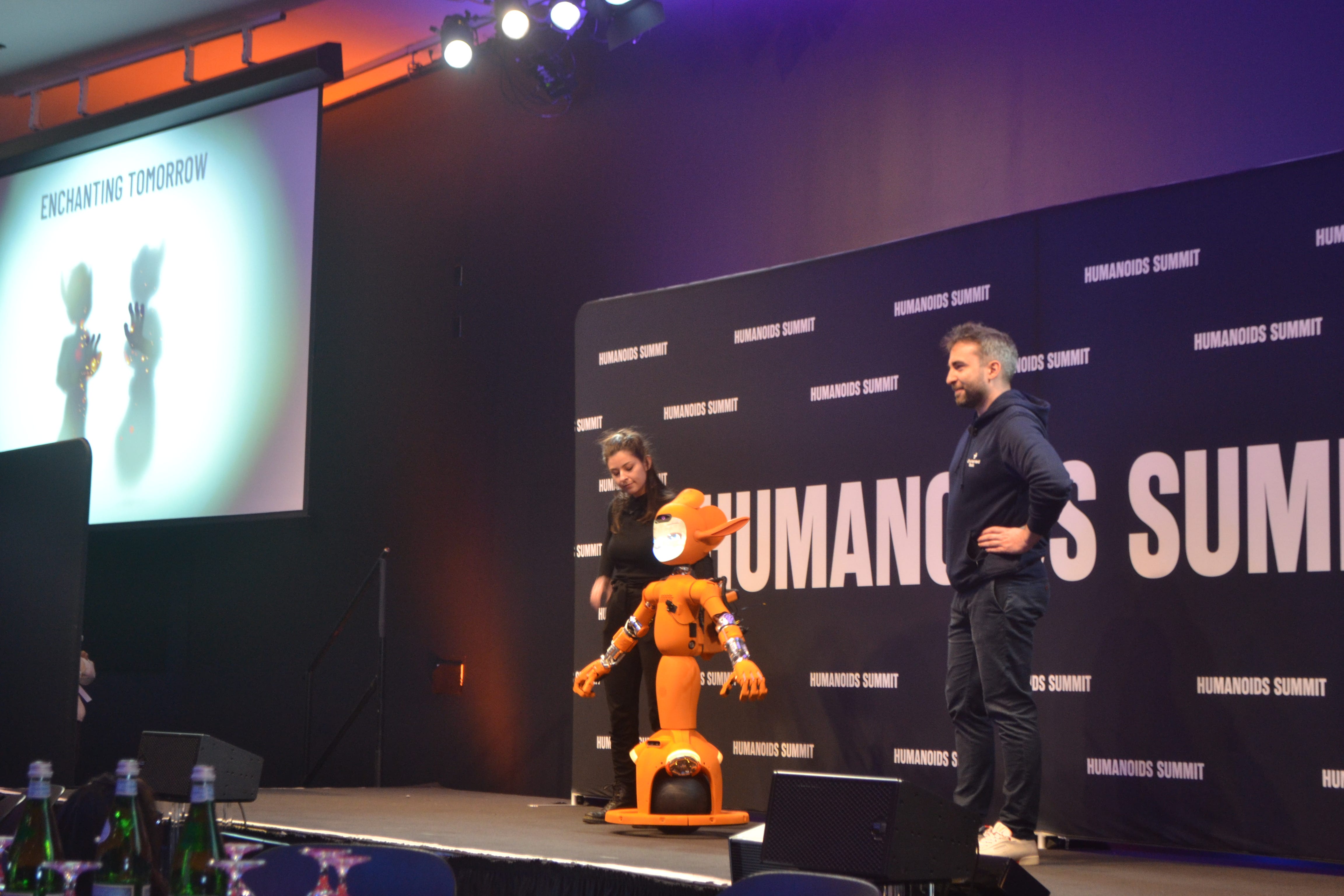Jerome Monceoux co-founder at Enchanted Tools, and former co-founder at Aldebaran Robots and creator of Pepper and Nao robots, gave a lively talk and brought Mirokai on stage at the Humanoids Summit gathering last week. Jerome wanted to build a robot that is reflecting people’s lives, and bridging worlds between virtual reality and real life by combining grasping, navigation and social interaction to create a lively robot. Jerome felt that the humanoid robot gives AI a way to act in the physical world, and designed Mirokai to reflect that. Therefore the robot design started by first designing the character and ensuring that enchanted robots robots are created for people. Here is a picture of Mirokai at a talk during Humanoids Summit.