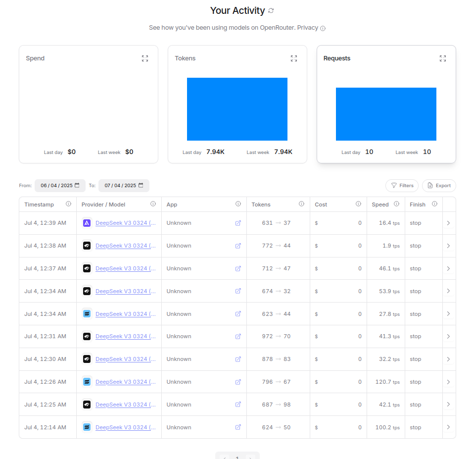 After setting this up, I can talk to Vector freely, without accruing any charges on my account. Below is a screenshot of my usage. Notice that all the costs are $0. Three different providers have been used to serve my requests. The speed has a wide range, from 1.9 tokens per second (tps) to 100.2 tokens per second (tps). At the slowest speed, I am waiting fro a bit for my Vector to robot. But hey, I don’t care as long as I get an answer, because I am using a free service.