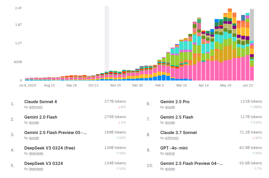 Openrouter.ai has really taken off in the Machine Learning Inference space… in just a few months, they have started processing 2 Trillion tokens every week, or close to 10 Trillion tokens a month. To provide a context, Google processes 480 Trillion tokens a month across all its services, including the behemoth Google search. Coming close to 1/50th of Google’s processing volume is no small feat. The following chart shows the growth in tokens processed. This chart also tells another story, the AI Inference space is exploding with use cases ranging from agentic AI, code completion, role play, to name a few.