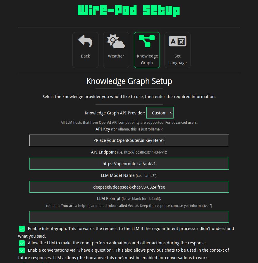 You can easily try openrouter.ai on Wirepod, and the best part is that you can try out many machine learning models for free. As an example, Openrouter.ai supports the DeepSeek V3 free version, which you can setup on Wirepod by referring to the following screen shot. (Note that I chose the free model in the LLM Model Name). You would have to get your own key from open router.ai