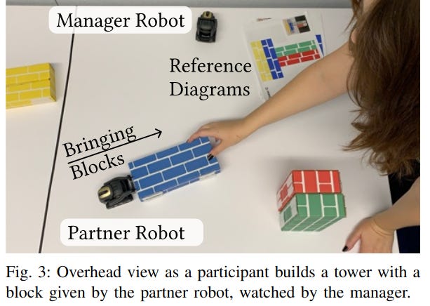 The study collected results on how the participants reacted to the instructions from the manager robot. Both robots were teleoperated in the study. The participants were asked to answer questionnaires, and were also observed on camera. Here is a picture from the paper showing how the participants interacted with the robots to build a tower with colored blocks.